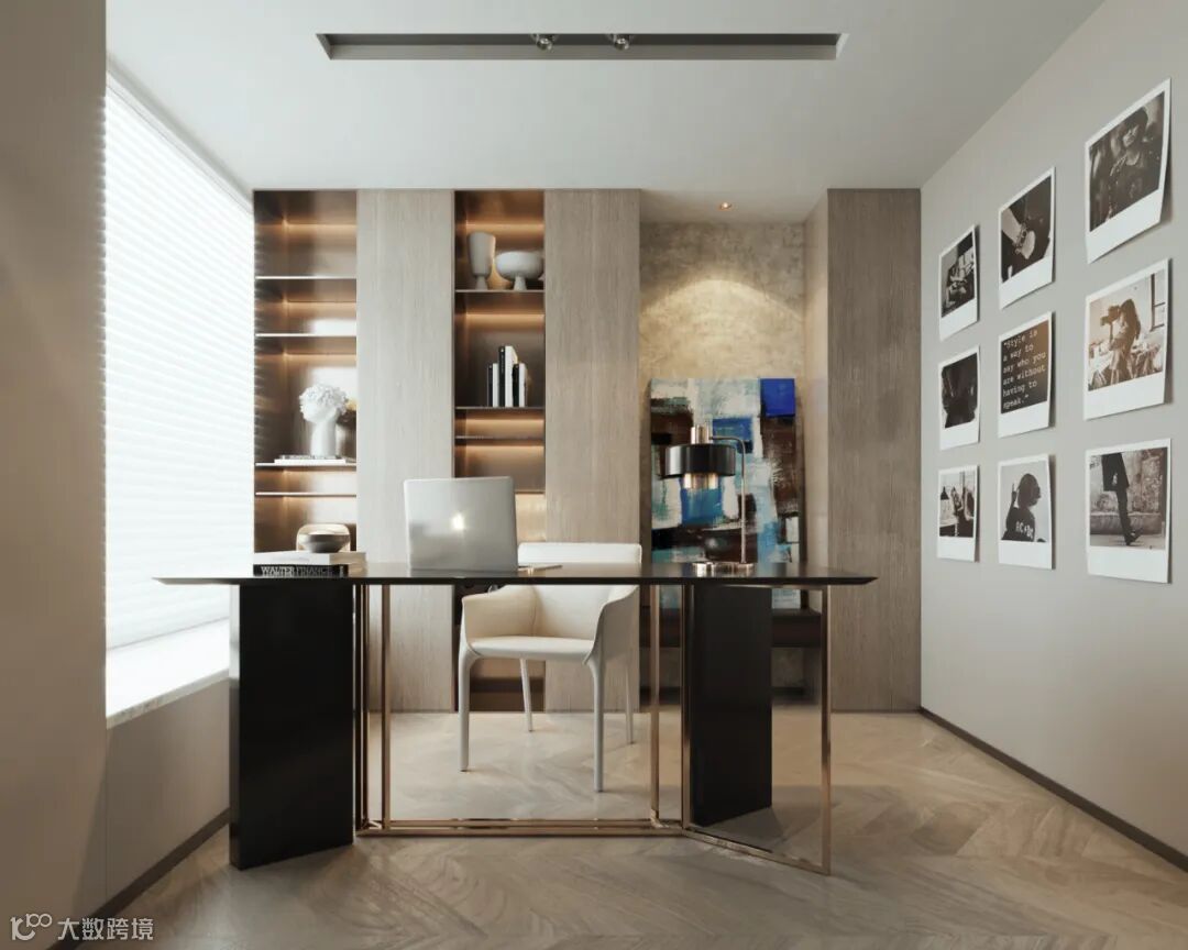 二层规划了独立书房与一方茶室,满足居者工作与休闲的不同心境需求。书房设计沉稳而高效,强大的收纳系统与临窗的宽敞书桌,营造出沉浸式的思考与工作环境。茶室则运用现代手法,以