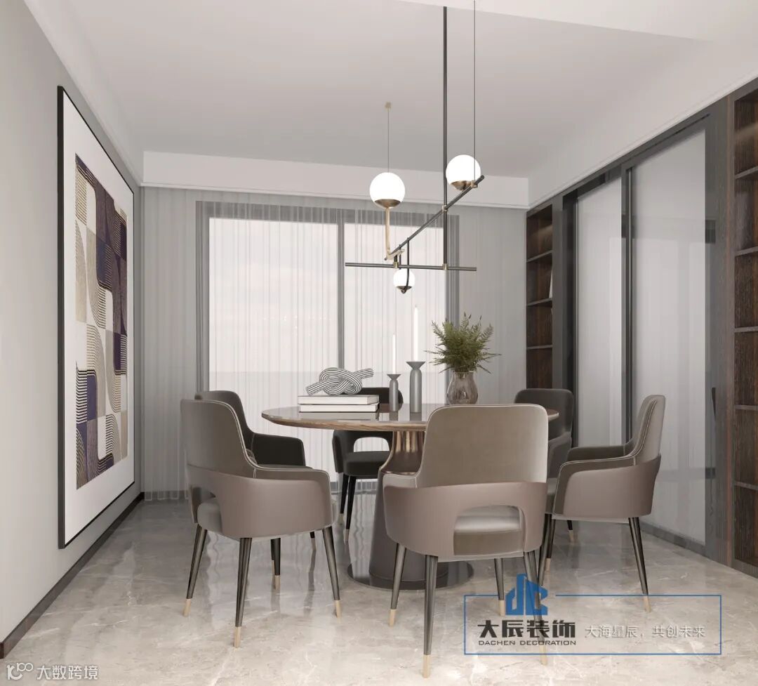 整洁清爽的餐厅,空间整体是一个灰雅的搭配,与客厅交相辉映,整体空间充斥着时尚气息。一家人其乐融融就餐的幸福时光。