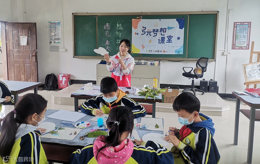 “一校一社工”志愿者杨慕冰在清远英德市大洞学校小学部开设“遇见·春天”植物拓印课堂