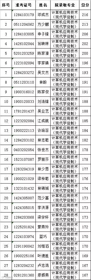 (3)现代学徒制专业(计算机应用技术)由我院自主命题和组织实施。文化素质考试和职业适应性测试的权重比例为2:1。普通高中考生入学测试总分满分值为300分,其中文化素质考试满分值为200分,职业适应性测试满分值为100分。