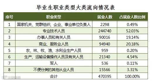 从就业职业类型大类(根据《中华人民共和国职业分类大典》的划分,共有8个职业大类,66个职业中类,414个职业小类,职业流向的统计不含出国出境、升学的毕业生)看,从事最多的职业类型是专业技术人员,占已就业毕业生数的52.03%,其次是商业、服务业人员,占已就业毕业生数的20.18%,第三是办事人员和有关人员,占19.14%。