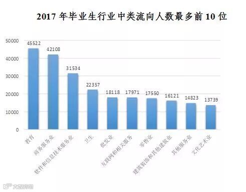 从行业中类看,教育是毕业生就业人数最多的行业中类,有4.55万人;其次是商务服务业,有4.21万人;第三是软件和信息技术服务业,有3.15万人。
