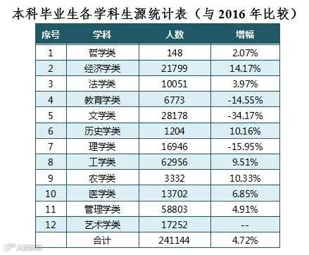 本科毕业生涵盖了12个学科,比2016年新增了艺术学类。与2016年相比,除艺术学类外,经济学类增幅最大,为14.17%;其次是农学类,为10.33%。除文学类外(文学类的艺术类专业已划入艺术学类),减少幅度最大的是理学类,为15.95%;其次是教育学类,为14.55%。