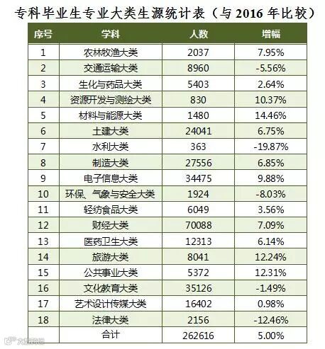 专科毕业生涵盖了18个专业大类。与2016年相比,材料与能源大类增幅最大,为14.46%;其次是公共事业大类,为12.31%。减少幅度最大的是水利大类,为19.87%;其次是法律大类,为12.46%。