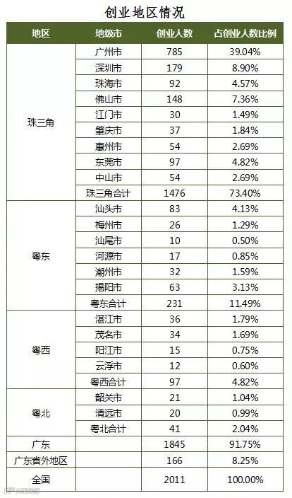 从创业地区看,毕业生基本上选择在广东创业,占创业人数的91.75%。在广州市创业的人数最多,有785人,占创业人数的39.04%,其次是深圳市,占8.90%。选择在珠三角地区创业的占创业人数的73.40%。