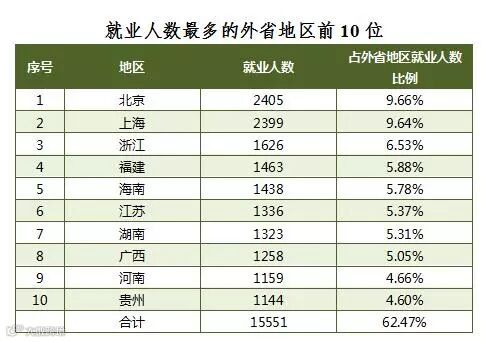 到广东省外地区就业的有2.49万人,占已就业毕业生数的5.29%,约有一半的外省生源毕业生选择留粤就业。外省地区中,到北京市就业的最多,有2405人,占到外省地区就业毕业生的9.66%;其次是上海市,有2399人,占9.64%;第三是浙江省,占6.53%。