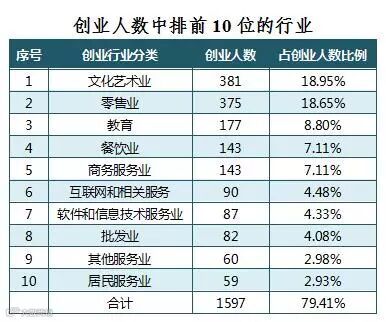 从行业分类看,选择在文化艺术业创业的最多,占创业人数的18.95%,其次是零售业,占18.65%。