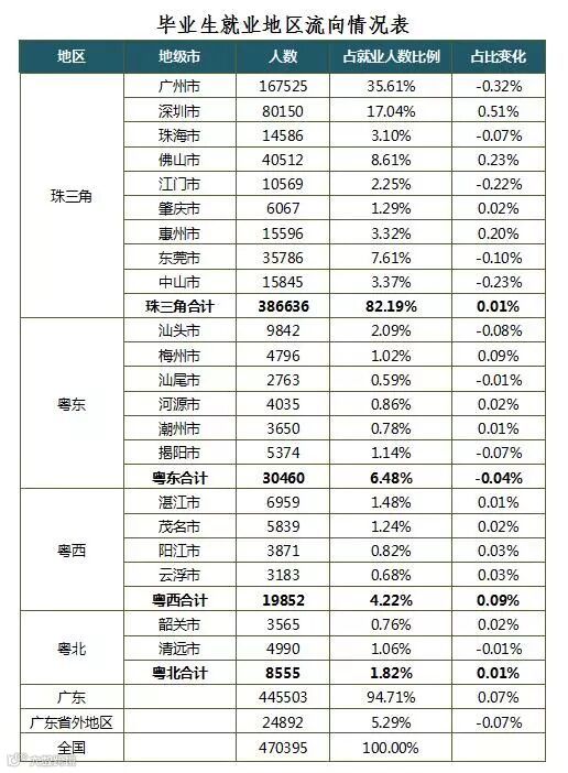 毕业生就业地区(就业地区流向的统计不含出国出境、升学的毕业生)中,在广东省就业的占已就业毕业生的94.71%。珠江三角洲地区9个地级市,共吸纳38.66万毕业生,占已就业毕业生数的82.19%,其中到广州市就业的毕业生最多,有16.75万人,占已就业毕业生的35.61%;其次是深圳市,有8.02万人,占17.04%;第三是佛山市,有4.05万人,占8.61%。粤东、粤西、粤北地区分别吸纳6.48%、4.22%、1.82%的已就业毕业生。