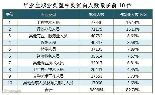 从职业中类看,工程技术人员比例最大,占已就业毕业生数的16.44%,其次是行政办公人员,占15.13%,第三是其他商业、服务业人员,占8.66%。
