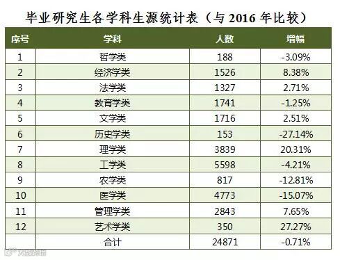 毕业研究生涵盖了12个学科。与2016年相比,艺术学类增幅最大,为27.27%;其次是理学类,为20.31%。减少幅度最大的是历史学类,为27.14%;其次是医学类,为15.07%。