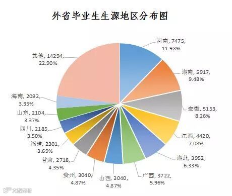 外省生源毕业生有6.24万人,占11.81%。在外省生源中,河南省生源最多,有7475人,占外省生源数的11.98%;其次是湖南省,有5917人,占9.48%;第三是安徽省,有5153人,占8.26%。