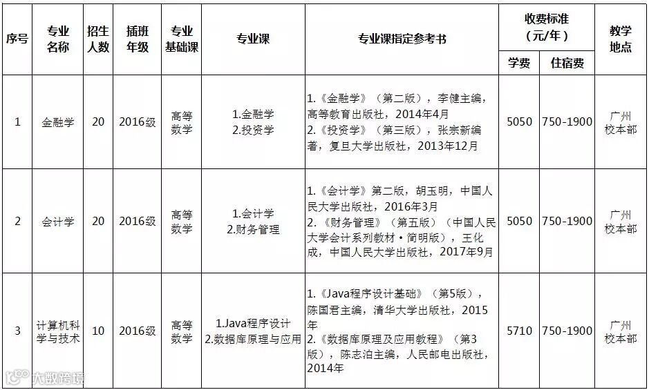 广东金融学院2018年本科插班生招生专业目录