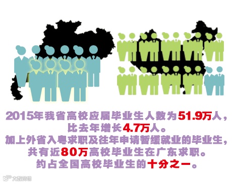 •2014年10月至2015年6月期间,省教育厅面向2015届高校毕业生举办69场全省性的供需见面活动,比上年同期增加11场,共计15000多家企业参加招聘活动,提供岗位数34万多个,入场学生超过84万人次;全省各高校共举办大型招聘会294场,共计3.6万家企业参加招聘活动,提供岗位81万多个,举办用人单位宣讲会8800多次,共计1.4万多家企业参加,提供岗位21.8万多个。