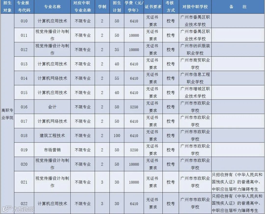 2、其中对接中职学校广州市市政职业学校视觉传播设计与制作、计算机应用技术专业,学制3年,只招收持有《中华人民共和国残疾人证》的普通高中、中职应往届听力障碍考生。