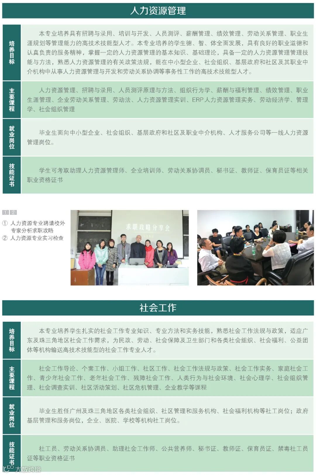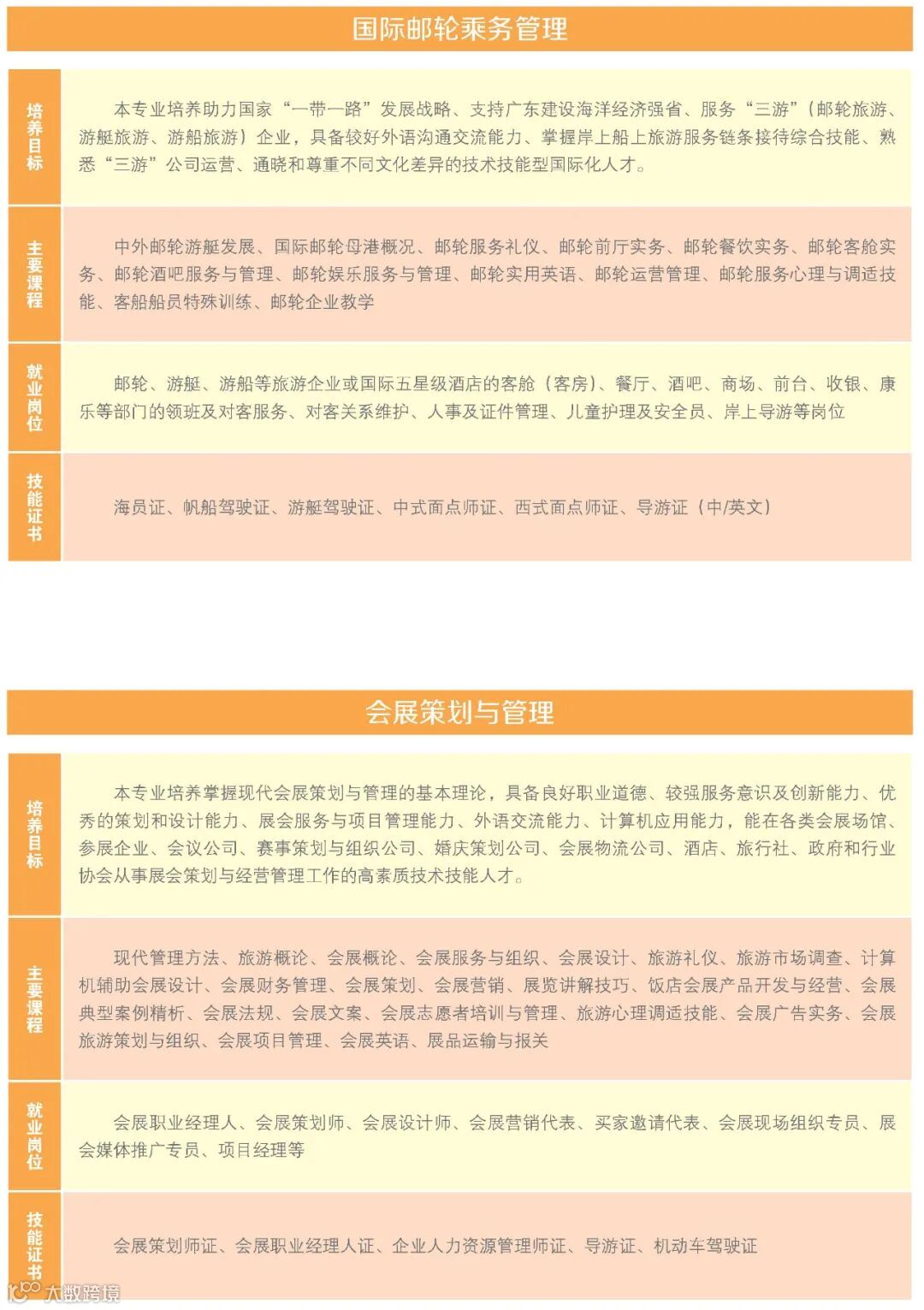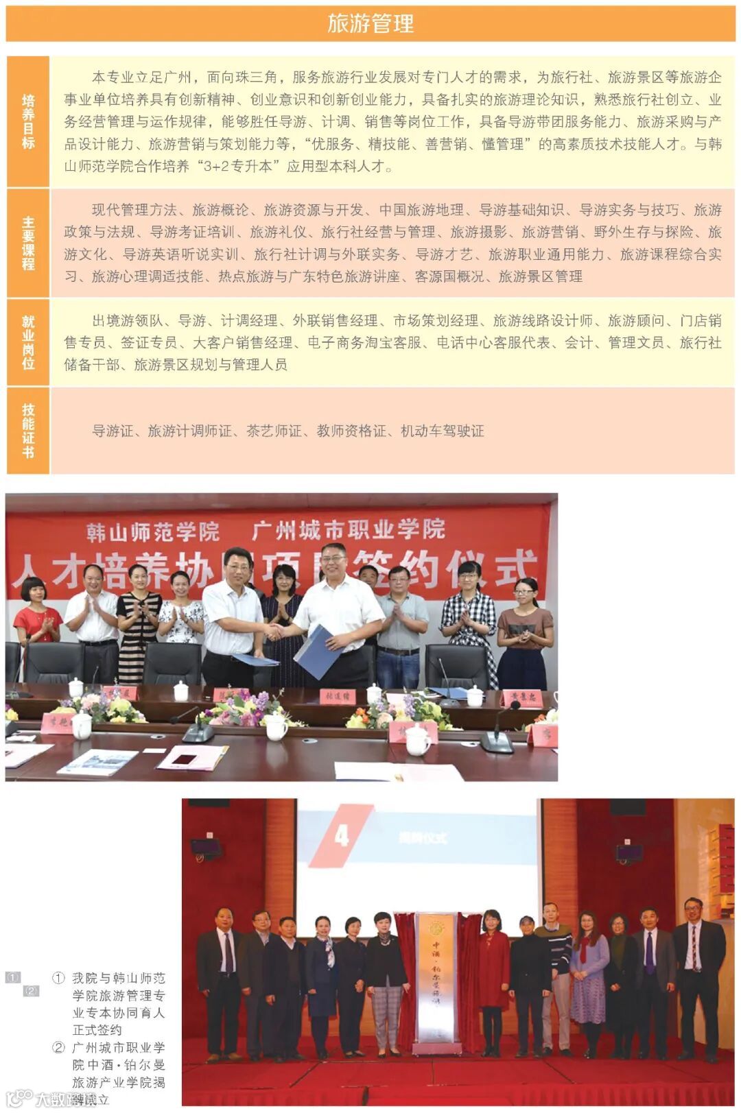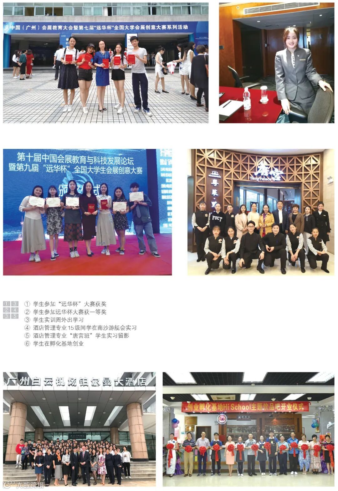 旅游管理、酒店管理、会展策划与管理专业为学校传统优势和特色专业,国际邮轮乘务管理专业是广东和广州重点扶持开办的新专业,培养的学生综合素质高,在品牌企业实习,就业率高,薪酬待遇好,深受用人单位好评。参加各类职业技能竞赛和创新创业类大赛多次获得一等奖和最佳组织奖,各专业招生就业两旺,报到率高,历届毕业生就业率均为100%。