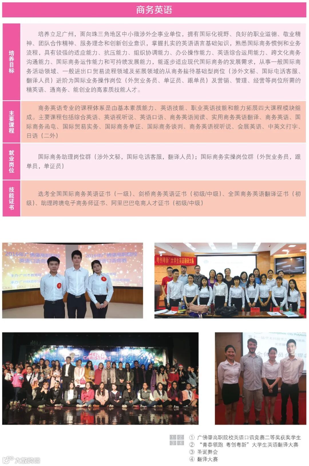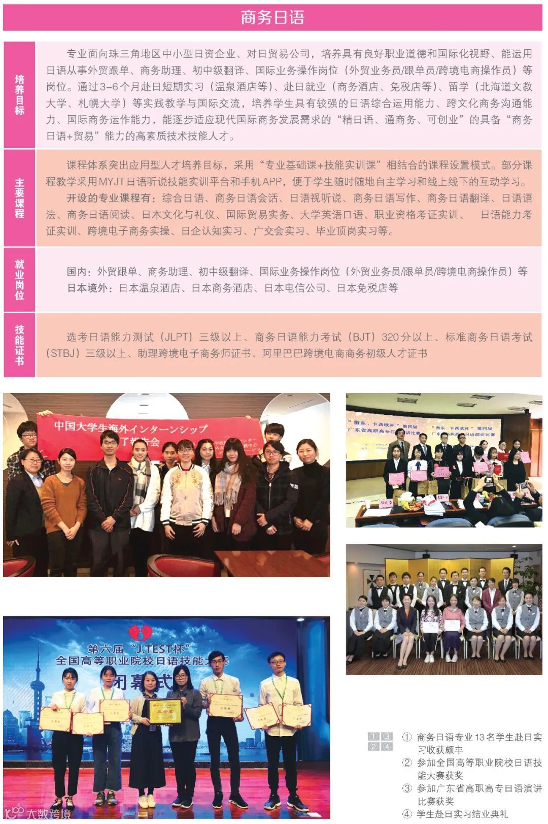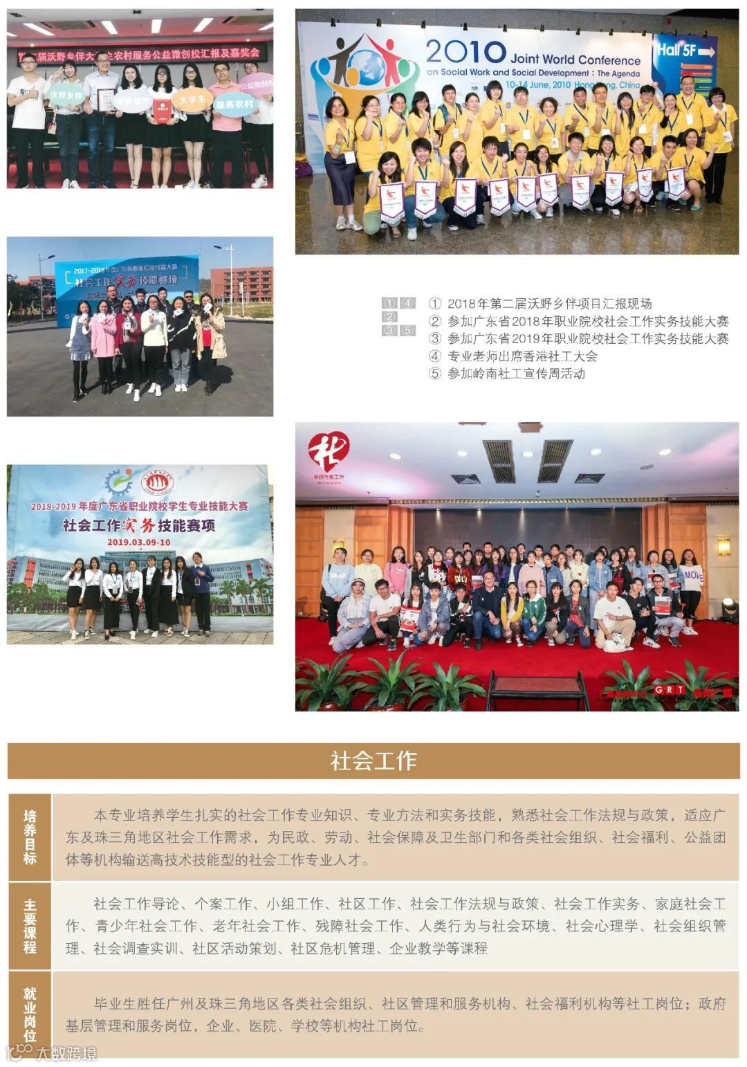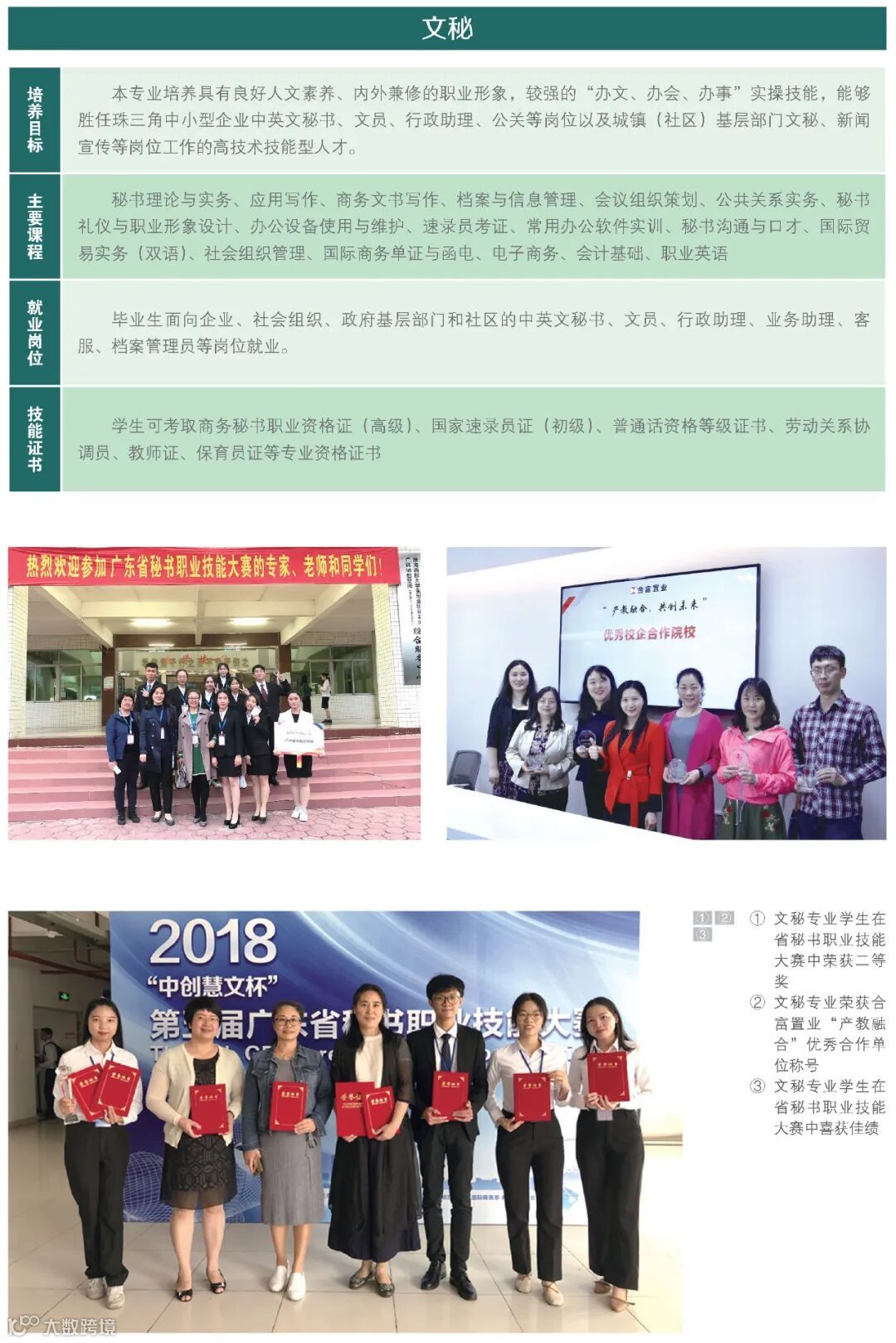 旅游管理、酒店管理、会展策划与管理专业为学校传统优势和特色专业,国际邮轮乘务管理专业是广东和广州重点扶持开办的新专业,培养的学生综合素质高,在品牌企业实习,就业率高,薪酬待遇好,深受用人单位好评。参加各类职业技能竞赛和创新创业类大赛多次获得一等奖和最佳组织奖,各专业招生就业两旺,报到率高,历届毕业生就业率均为100%。