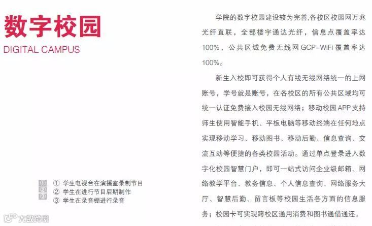 新生一入校,学号即是个人上网账号。图书馆实现无线WIFI全覆盖,通过单点登录进入数字化校园,即可便捷访问企业级永久邮箱、网络教学、教务信息、个人信息查询、留言板等校园生活各方面的信息服务。移动校园APP可支持师生使用智能手机、平板电脑等移动终端在任何地点接入校园网,实现接收移动学习、消息推送、信息查询、交流互动等便捷的各类校园活动。校园卡可用于跨校区图书通借通还。
