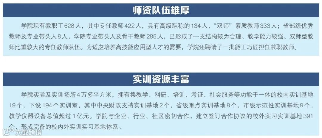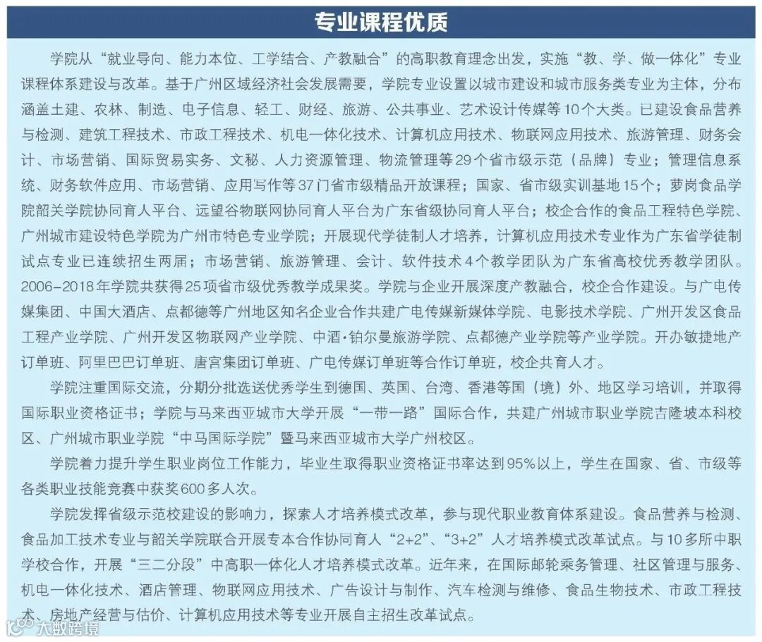 花都校区建设有完善的人才培养体系,以深化产教融合、校企合作,提升人才培养质量为办学目标,重视教学管理和教学质量,拥有一支经验丰富的“双师型”教师队伍。学院立足行业、发挥专业优势,大力开展校企合作,为学生的实习和就业创造了良好的条件。每年有大量与学院合作的企事业单位进入学校招聘,毕业生就业选择性越来越高,多年来毕业生供不应求,就业渠道畅通,就业质量高。学院开展以科技创新、文化素质教育、社会实践等为主题的校园文化活动,提高了学生的综合素质。