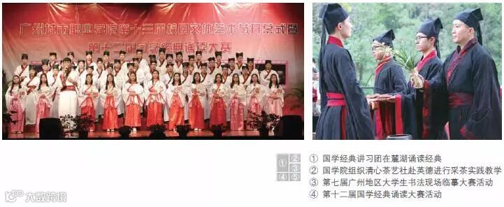 目前,广州城市职业学院国学院是国际儒学联合会团体会员、广东古琴研究会副会长单位、广东省茶叶行业协会团体会员、广州茶文化促进会团体会员、广州市中小学教师和中等职业学校教师继续教育培训基地以及广州岭南文化传播研究中心。学校国学教育成果受到专家和社会好评,《高职院校国学教育“一课三平台”模式的构建与实践》获2017年广东省教学成果奖一等奖,《高职院校中华优秀传统文化教育“一课三平台”育人模式的构建与实践》获2018年职业教育国家级教学成果奖二等奖,学校被评为全国职业院校非遗教育传承示范基地、广东省高职院校文化素质教育基地第一批建设单位,在全国产生了较大影响。