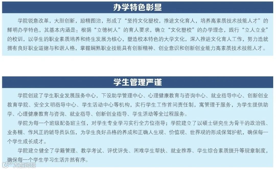 学院不断创新办学体制机制,改革人才培养模式,加强内涵建设,提高人才培养质量。建有中央财政支持专业2个、省市级品牌、示范专业29个,省市级课程37门,获得一大批国家、省(部)、市级教学成果奖和教学科研课题;实施专业与课程体系改革,建立基于职业岗位工作过程的职业课程体系,全面强化学生职业能力培养。着力推动创新创业教育与专业教育深度融合,实施面向全体学生的创新创业教育。学生在国家、省级和市级技能竞赛屡获优异成绩。毕业生双证书获取率达到97%,毕业生就业率连年超过98%,位居全省普通高校前列,毕业生社会评价满意率超过95%。