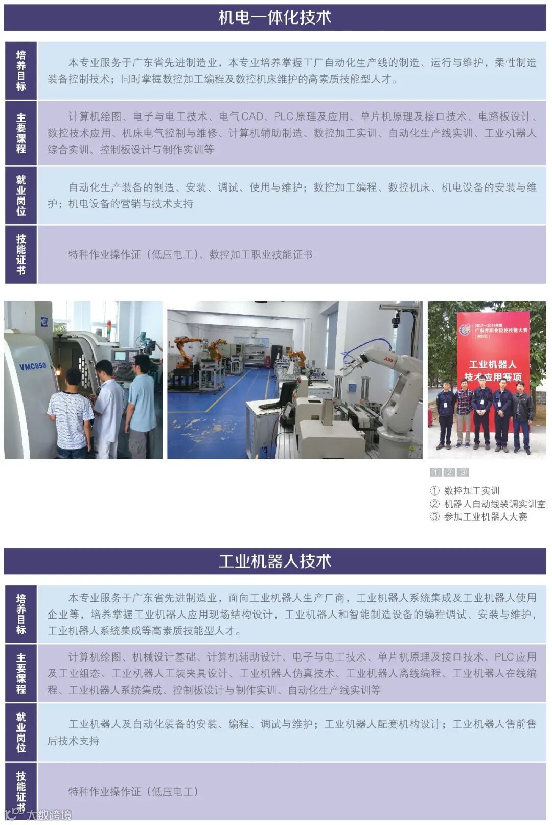 智能制造产业和新能源汽车产业是国家重点发展产业,机电工程系围绕国家重点发展战略和区域产业需求,共设置4个专业,构成机电类专业群。其中,围绕智能制造、智能化控制和智能化产品开发,开设机电一体化技术专业(广东省高职教育重点专业)、工业机器人技术专业和应用电子技术专业(校级创新创业示范专业)。围绕汽车后市场服务及新能源汽车技术,开设汽车检测与维修技术专业(广州市示范专业)。各专业按照最新产业发展需求进行人才培养,目标清晰,定位准确。