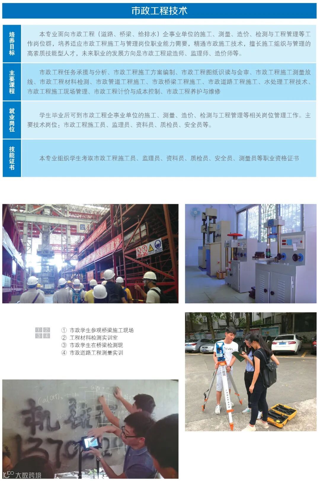 花都校区以市场需求为导向,构建“大市政”专业链群,现设专业20个,其中工程造价、给排水工程技术、道路桥梁工程技术、园林景观设计、室内环境设计等专业是广州市高职高专示范专业。学院聘请有一批各行各业的高级专业技术人员和高校教授参与教学与管理,成立有17个专业指导委员会。