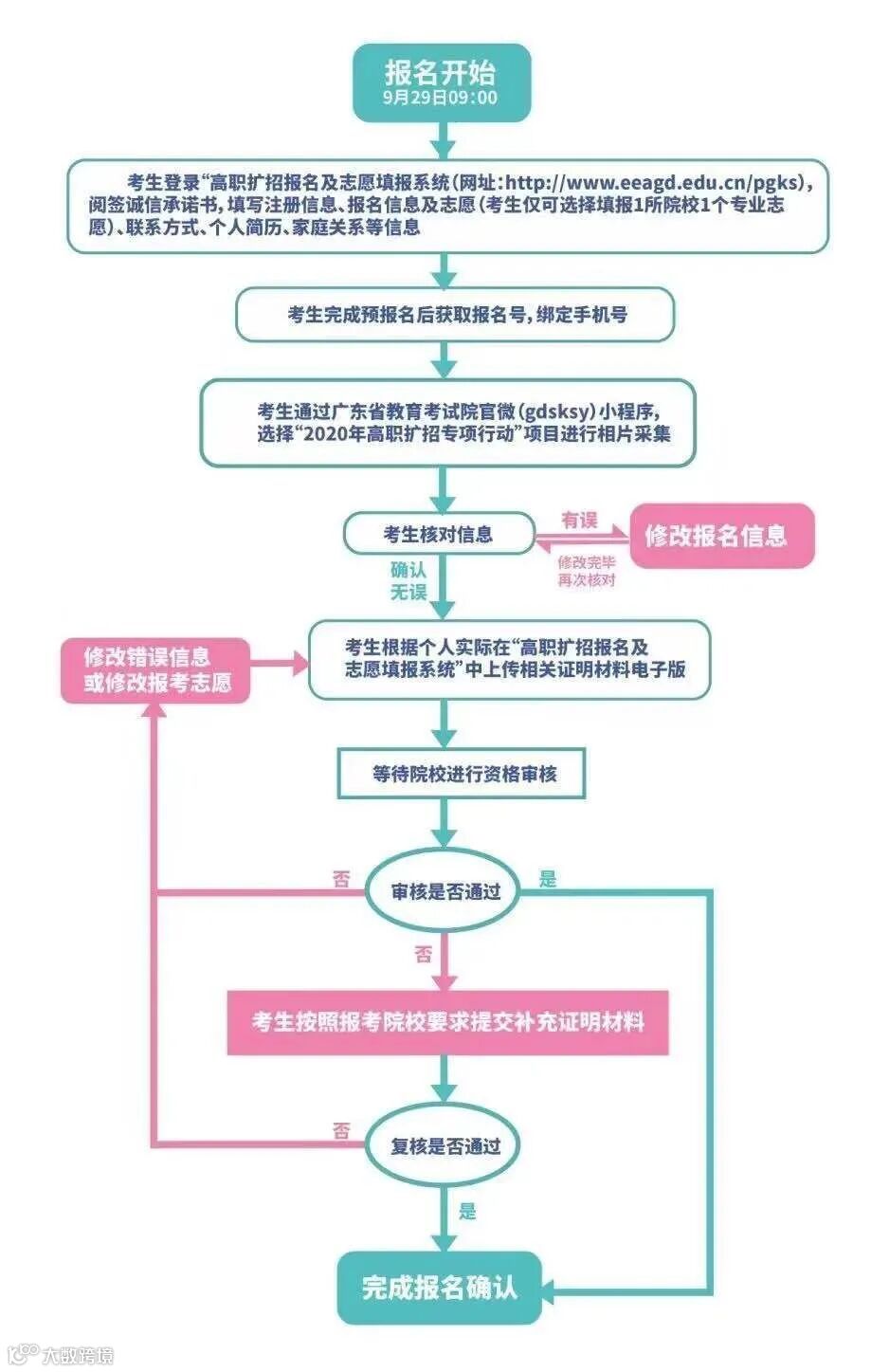 考生于2020年9月29日9:00至10月9日17:00登陆2020年高职扩招报名及志愿填报系统(http://www.eeagd.edu.cn/pgks)根据系统指引阅签诚信承诺书,填写注册信息、报名信息及志愿信息、联系方式、个人简历、家庭关系等信息,获取报名号、绑定手机号,通过微信小程序采集相片并经核对信息无误后根据实际按照要求上传相关证明材料电子版。