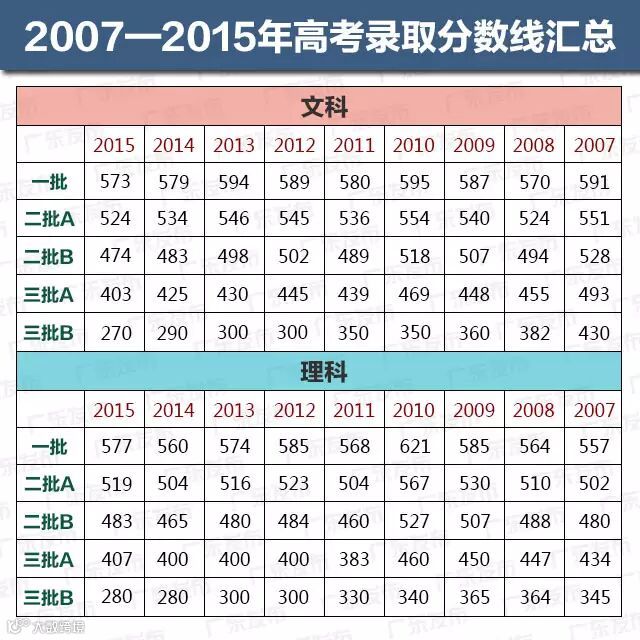 为帮助广大考生和家长了解广东历年录取情况,特整理2007-2015年广东高考各批次录取控制分数线,为考生填报志愿提供参考哦!快点大图对比一下吧~