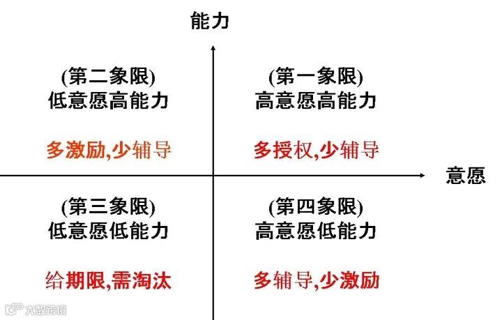关于用人的具体做法,这里主要跟大家分享能力意愿四象限。高意愿高能力的员工,应该多授权,少辅导;高能力低意愿的员工,应该多激励,少辅导;低能力低意愿的员工,应该选择淘汰;高意愿低能力的员工,应多辅导,少激励。