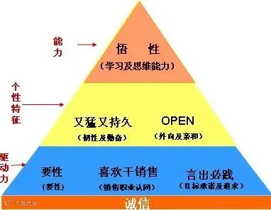 3、驱动力:有要性,对于赚钱的欲望,是要,还是想要,还是一定要。然后是喜欢干销售,认同销售的这份职业。再有是言出必践,忠诚于目标,捍卫目标;