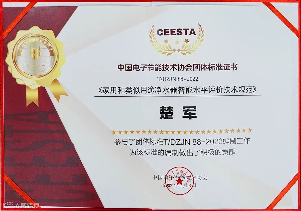 2022年优口受邀参加中国电子节能技术协会(CEESTA)主办的团体标准《家用和类似用途净水器智能水平评价技术规范》编制会议,总工程师楚军先生作为代表,全面参与了标准编制工作并荣获证书。