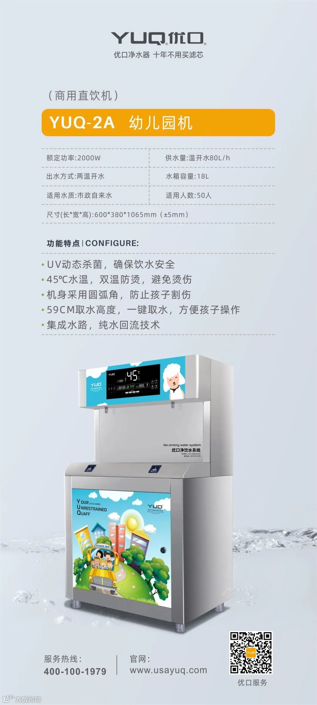 自从上了幼儿园,芋芋没有一个月不请假,感冒咳嗽是家常便饭。芋芋妈妈很是头痛!后来听同事讲,孩子上了幼儿园,因为贪玩耍,会忘记喝水,那是肯定会上火!与老师了解了情况后确实如此。但近一个月来,芋芋不再频繁地咳嗽、感冒了,原来是幼儿园安装了优口幼儿园专用饮水机,卡通造型芋芋特别喜欢,两个温水龙头,孩子自己打水自己喝!重要的是这款饮水机配置UV杀菌和纯水回流技术,保障孩子们喝的每一杯水,都安全又健康!老师们安心,妈妈更放心!