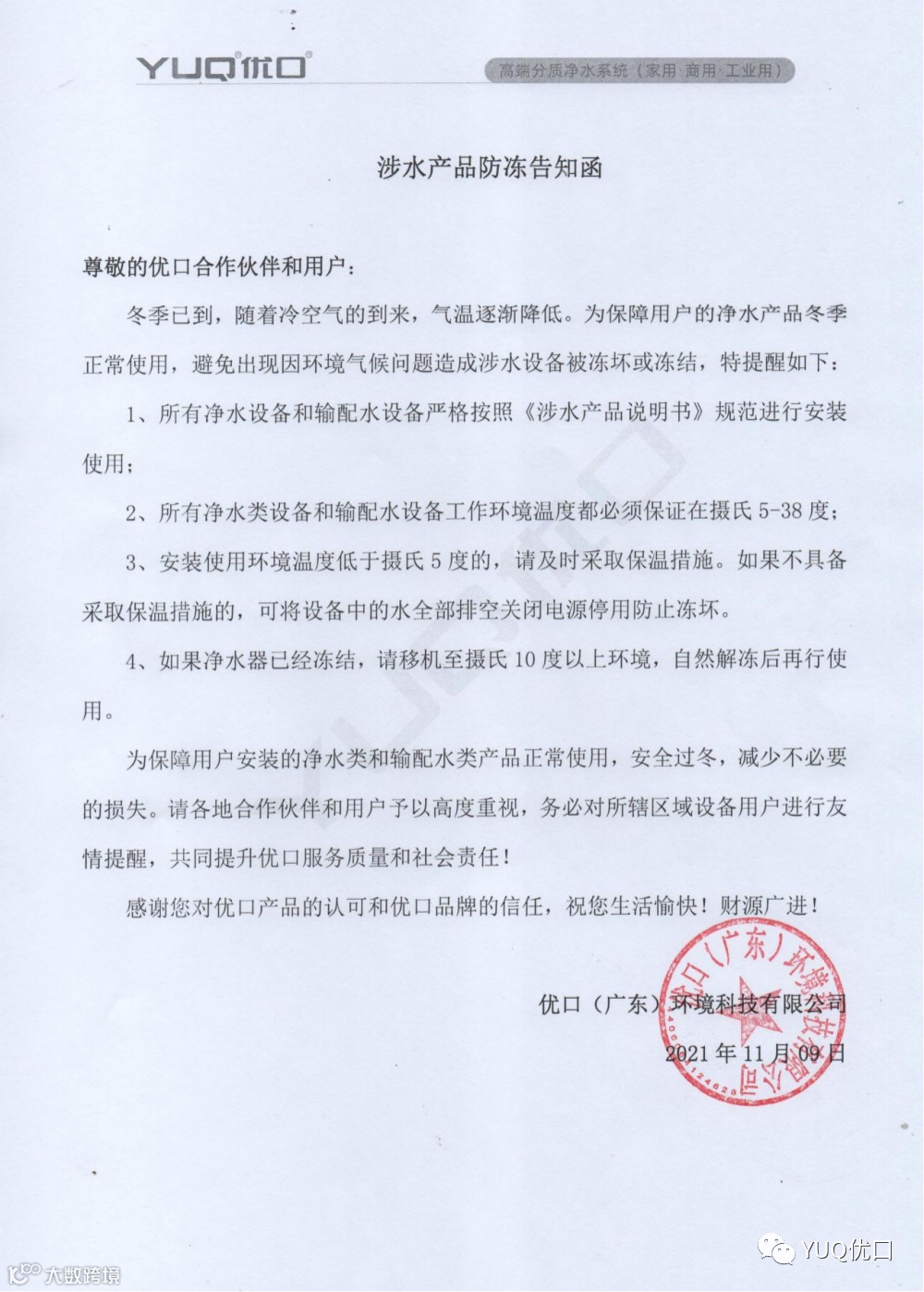 此外,有不少安装净水器的家庭及单位在冷空气袭击下发生意外情况,若不注意保养,很容易出现爆裂漏水或堵塞现象。为防止意外发生,净水系统的防寒保暖工作尤其值得注意,今天优口净水系统体验馆为大家介绍一些净水器冬季防范措施及使用注意事项。