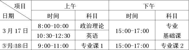 普通高校本科插班生招生考试时间为2018年3月17日(星期六)至18日(星期日)两天,具体安排见下表