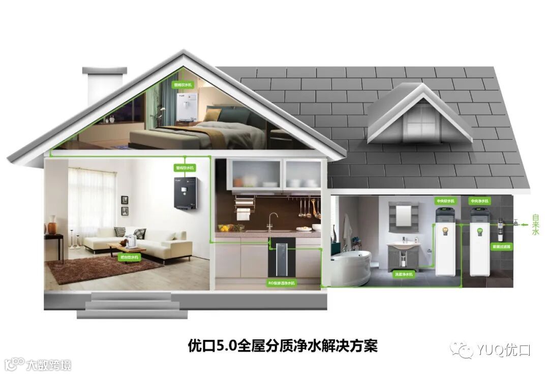 优口全屋分质净水是对整个房屋的用水进行分类、并根据水的用途和使用场景进行分质处理。从自来水进水入户,前置过滤器初步的过滤大颗粒杂质、中央净水机对整个房屋用水初级处理,去除余氯及污染物,后续对水的用途大致分成洗涤用水、洗漱用水和饮用水:洗涤用水可以用中央软水机对热水器或洗衣机用水进行过滤,去除水中钙镁离子;洗漱净水机功能是把我们日常洗脸、洗手、刷牙的水平进行深度处理,达到洁净无菌标准,洗漱更干净柔顺;饮用水可以分到厨房、客厅、卧室。全方位实现饮水和生活用水分质、分流,满足优质优用、低质低用的要求。最终实现:饮水用水分质净、安全健康更省芯!
