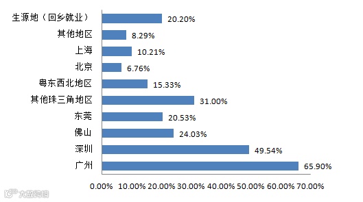 从2018年毕业生理想就业地区(可多选)调查 (数据来源于《2018年高校毕业生就业意向调查问卷》,调查时间为10月8日至10月20日,共发出14.44万份调查问卷,回收10.84万份有效问卷,覆盖全省所有学历层次和学科专业)看,65.90%的毕业生有意向在广州就业,其次是深圳,有49.54%。较少毕业生选择粤东西北地区和外省地区就业。预计2018年粤港澳大湾区仍是广东省绝大多数毕业生就业首选地区。