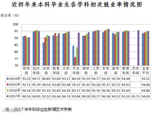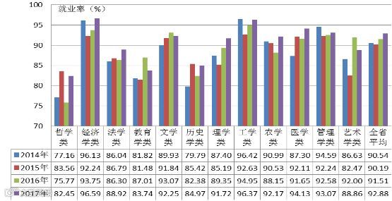 本科生就业率相对较高的学科有经济学类、工学类、农学类,管理学类,而历史学、法学类和哲学类的就业率则低于全省平均水平。