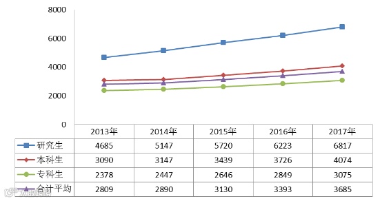 我省高校毕业生平均初次就业月薪逐年不断提高,从2013年的2809元到2017年的3685元,增加了31.19%,每年约以5.58%速度增长。
