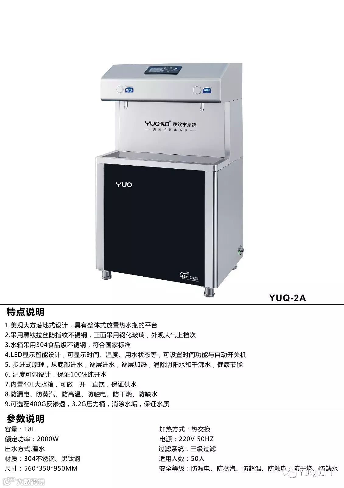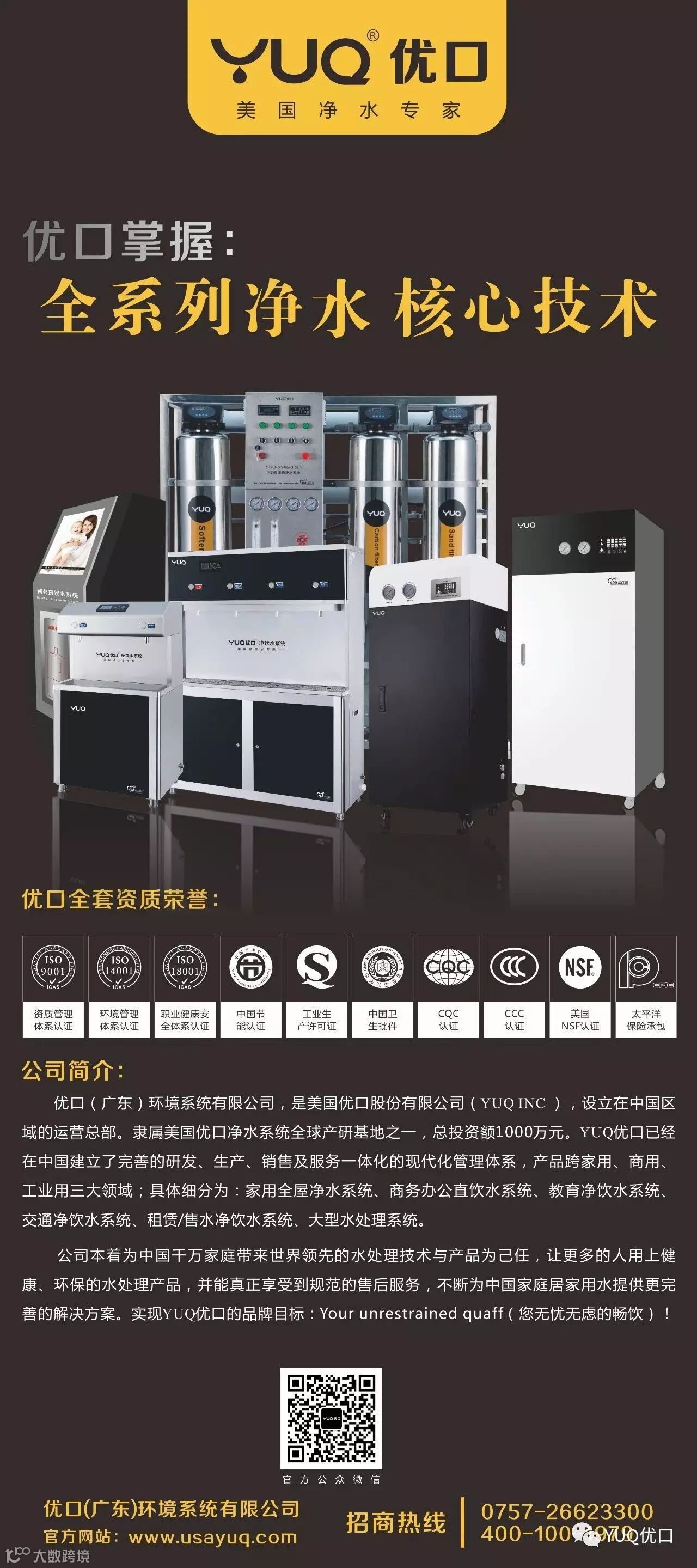 美国优口股份有限公司(YUQ INC)诞生于美国纽约,是一家拥有全线水净化技术,集家庭生活饮水、商务公共场所饮水、工业生产用水技术研发与设备生产于一体的高新技术企业。