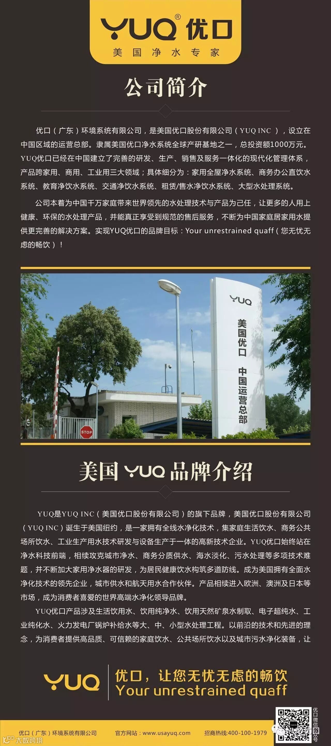 优口(广东)环境系统有限公司,是美国优口股份有限公司(YUQ INC ),设立在中国区域的运营总部。隶属美国优口净水系统全球产研基地之一,总投资额1000万元。YUQ优口已经在中国建立了完善的研发、生产、销售及服务一体化的现代化管理体系,产品跨家用、商用、工业用三大领域;具体细分为:家用全屋净水系统、商务办公直饮水系统、教育净饮水系统、交通净饮水系统、租赁/售水净饮水系统、大型水处理系统。