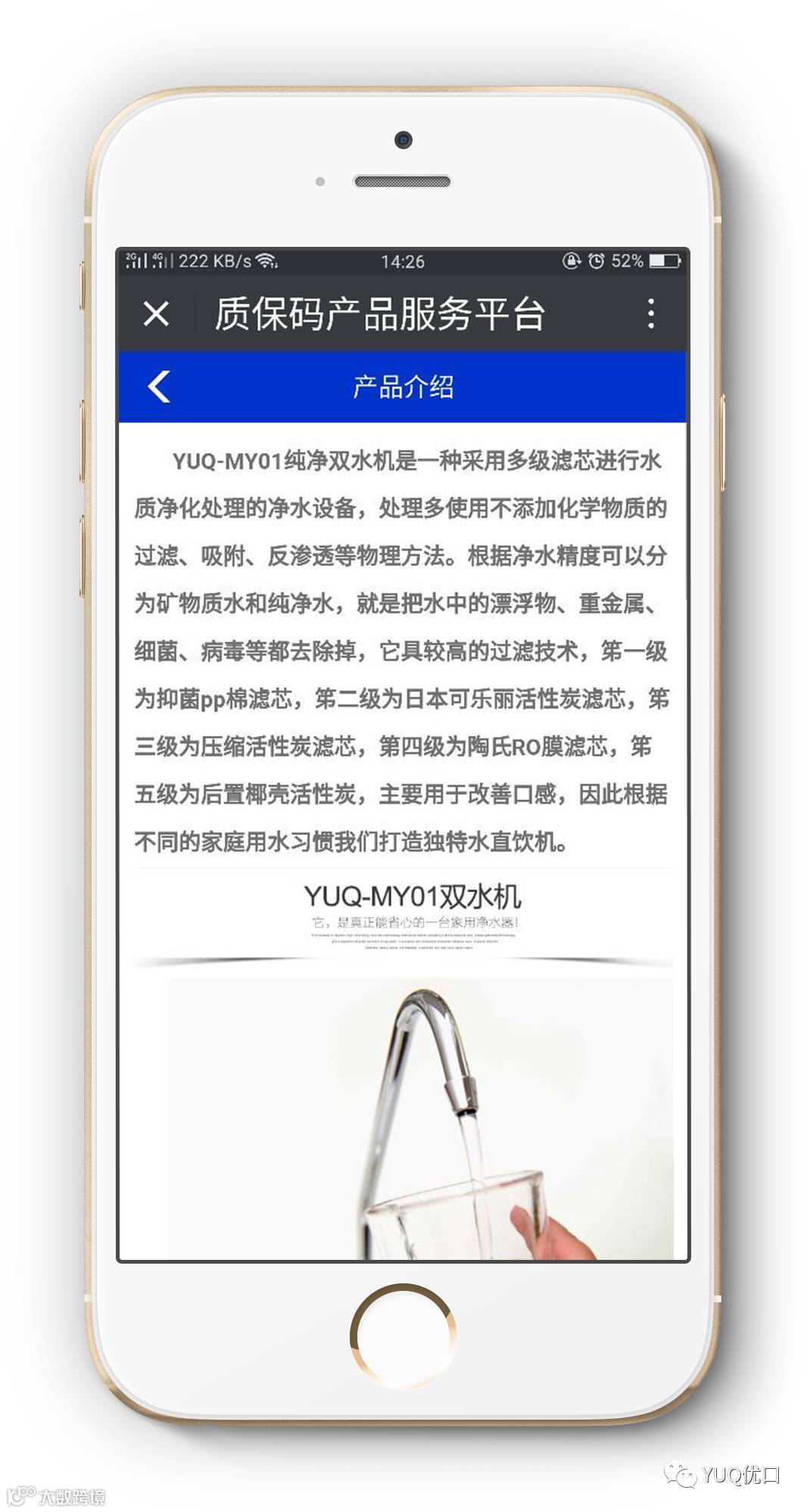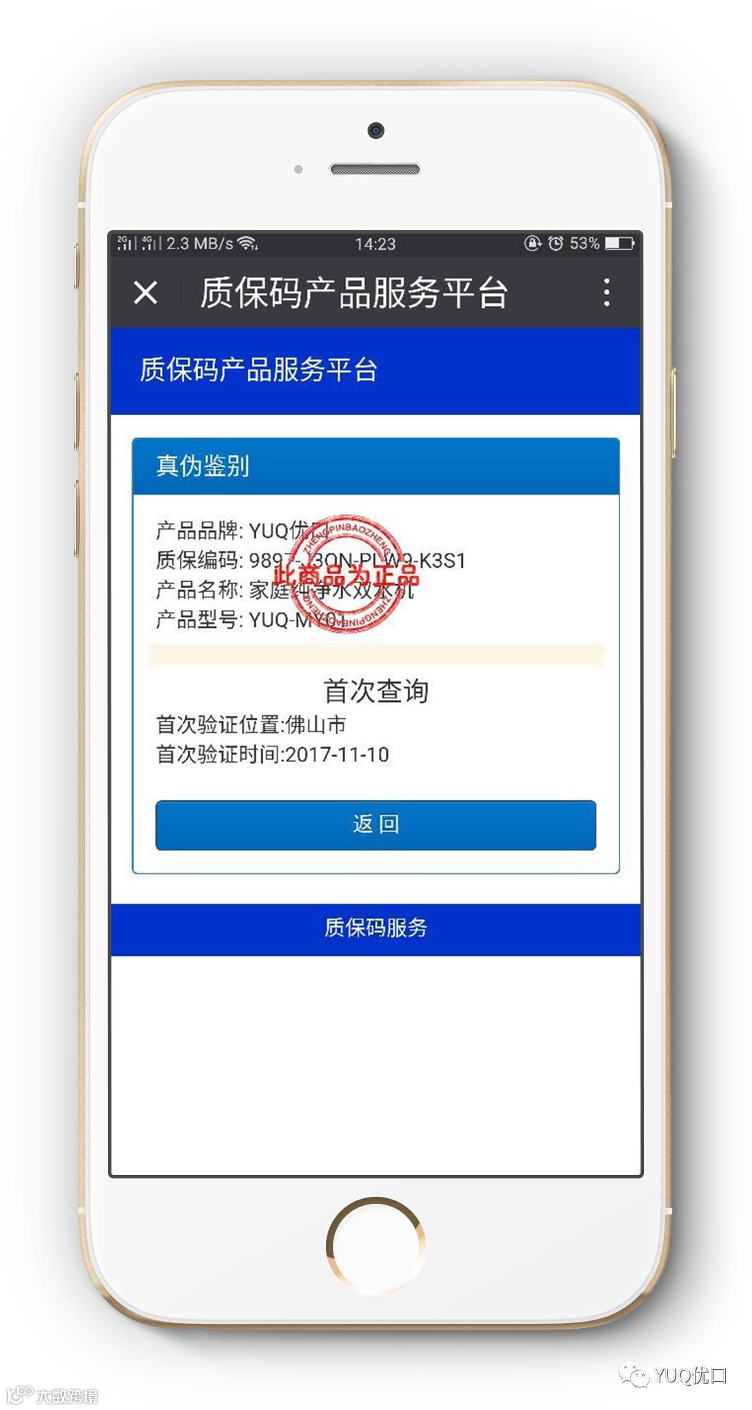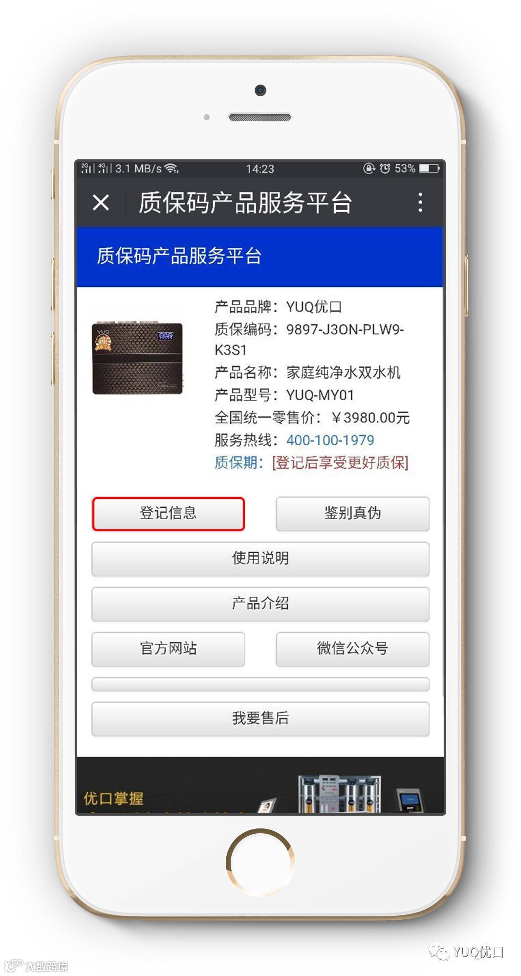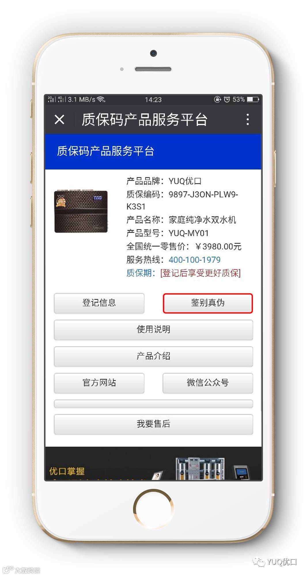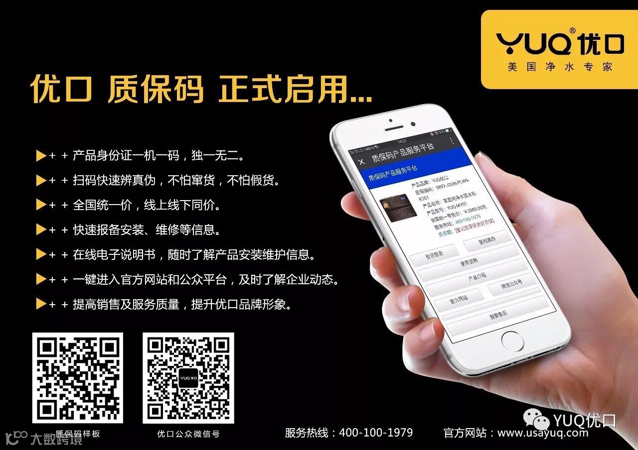 在这信息高速发展和快节奏生活的时代,人有身份证实时联网认证,才有越来越完善的治安管理,才有国泰民安;产品也一样,只有有了身份码才不会出现假冒伪劣产品,才能保障消费者的权益。优口净水产品已正式启用产品身份码,每台机器都有一个独一无二的身份码即质保码。质保码让消费者不再担心质量和售后问题,市场区域得以规范,经销商不在担心串货问题。