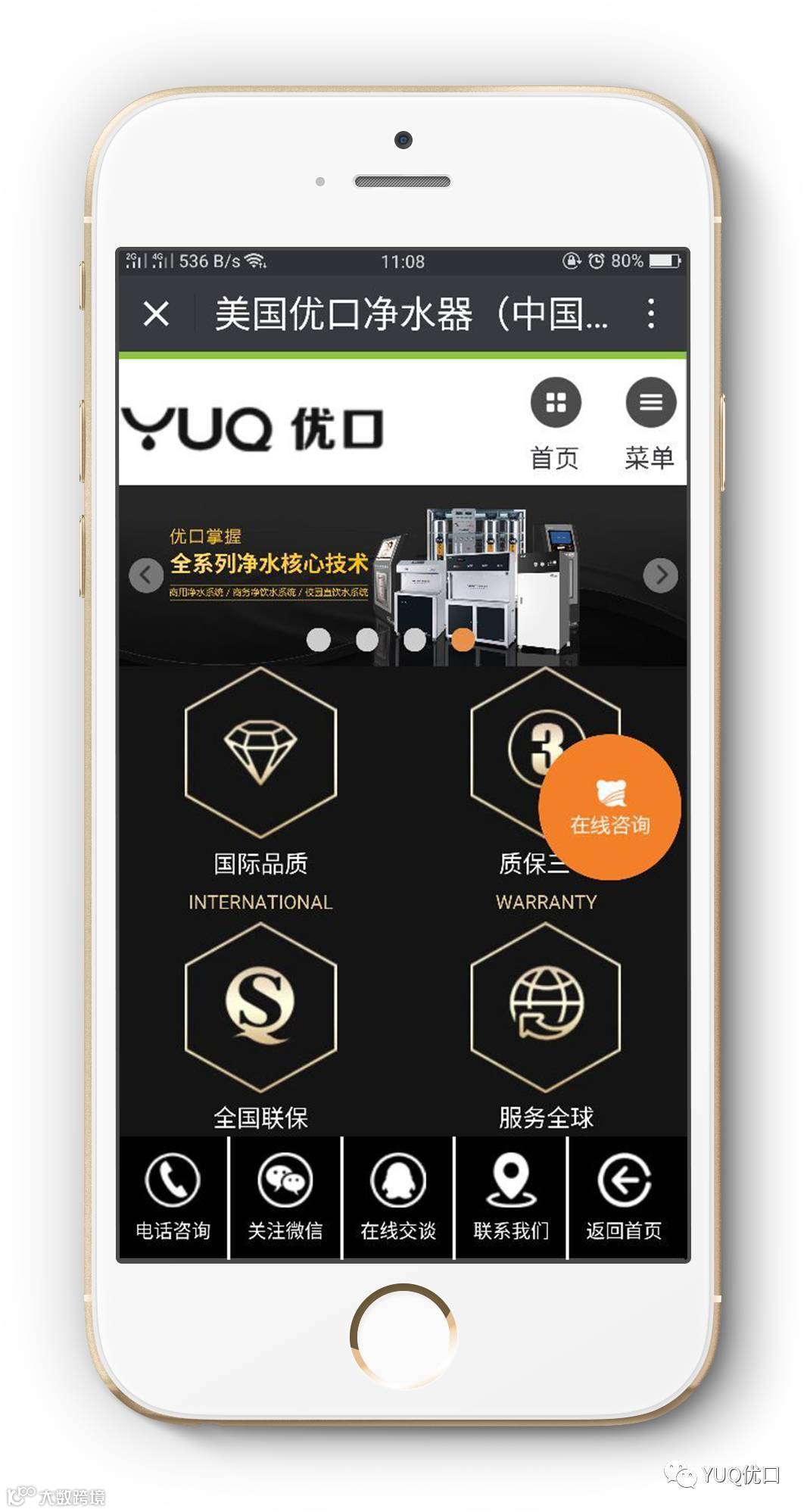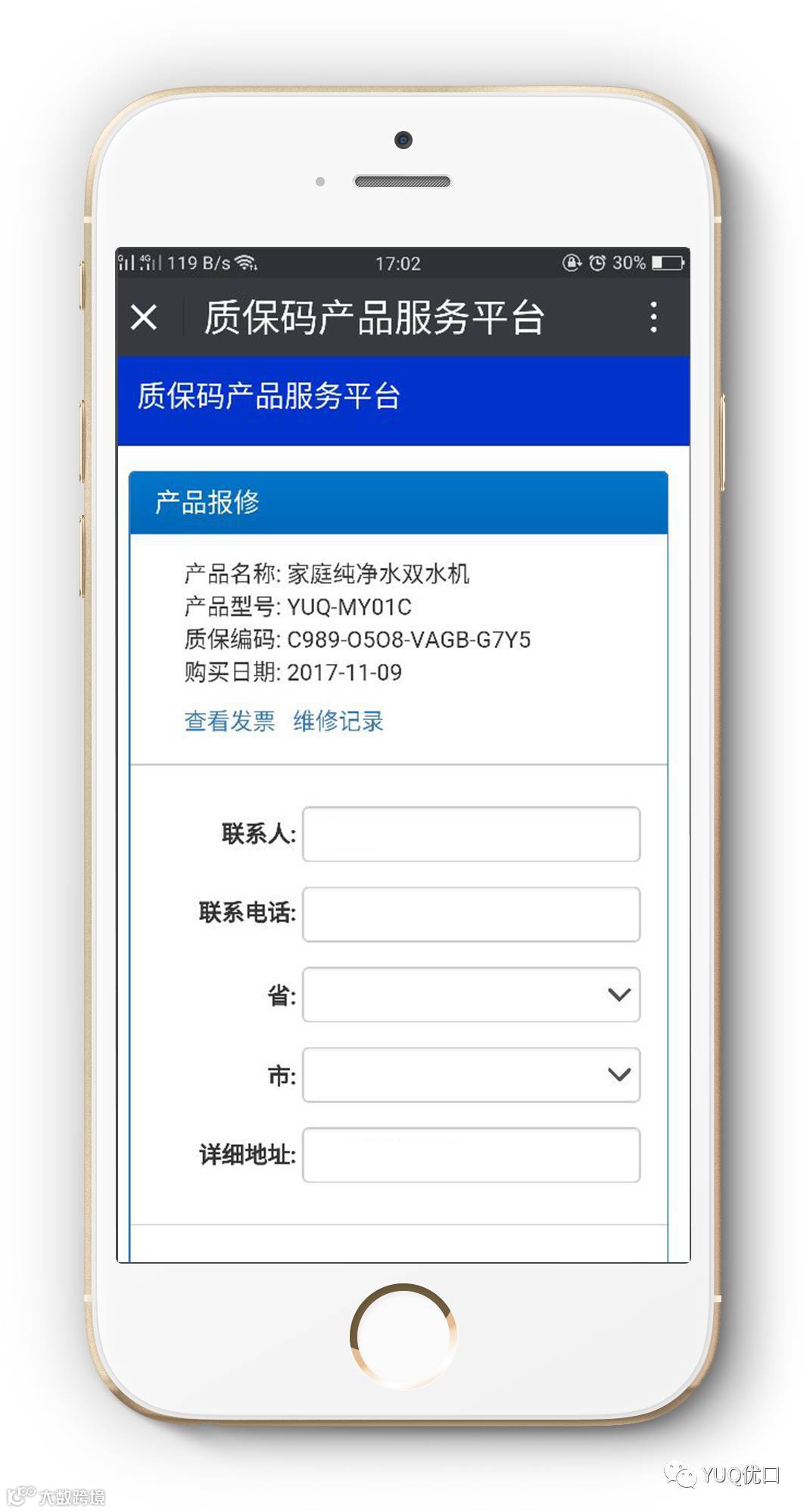 优口净水一机一码为客户提供服务跟踪、维护维修记录、质量跟踪、内部工作协同的全程服务一体化管理系统。从而让客户真正的体验到一键操作售后无忧,最终真正实现YUQ优口的品牌目标:Your unrestrained quaff(让你无忧无虑的畅饮)