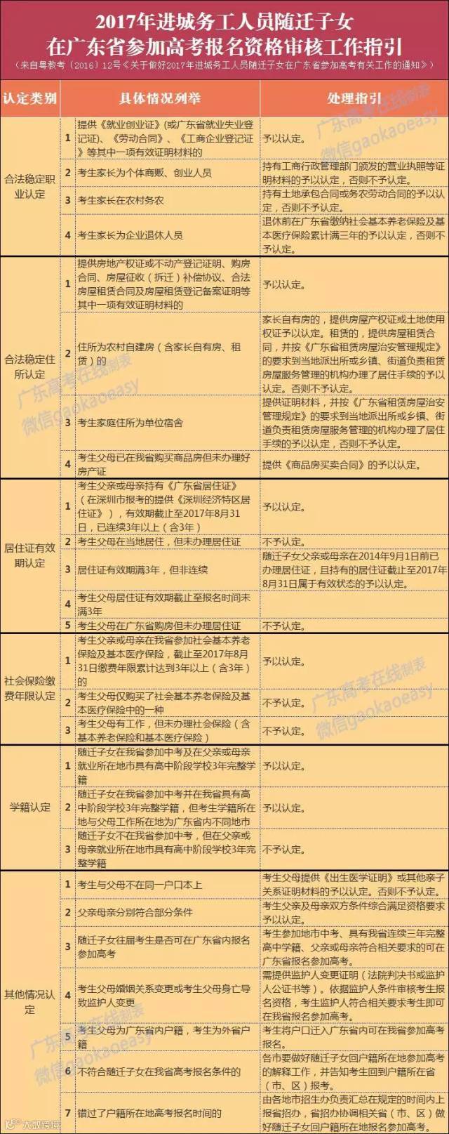 随迁子女在广东省报名参加高考资格审核的具体情况按以下的《2017年进城务工人员随迁子女在广东省参加高考报名资格审核工作指引》执行。