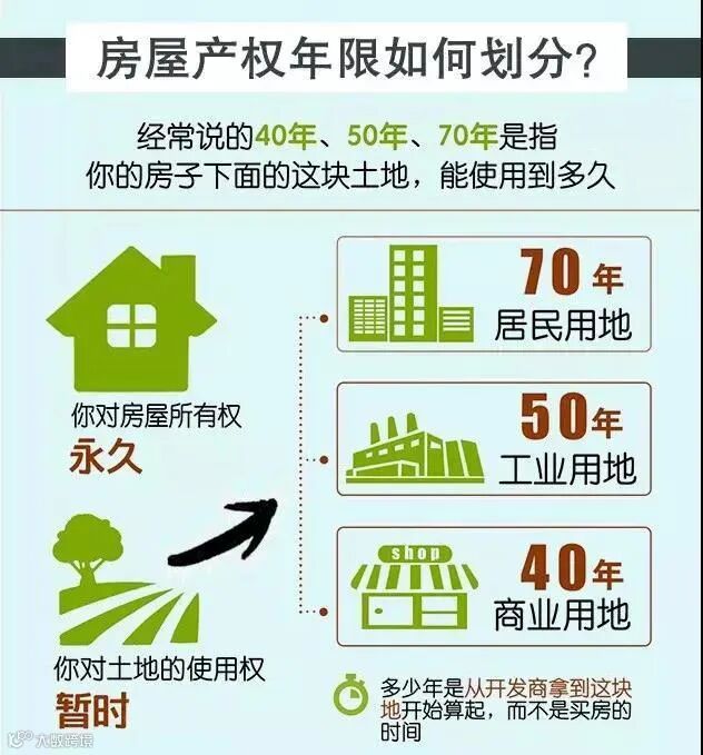 一般情况下,房屋的产权是永久的,但房屋所占用的土地却是有使用年限限制的(即土地使用权)。使用权年限在土地出让时,已经根据开发类型的不同,划分为不同的使用年限了,民用住宅土地的使用权年限为70年;工业建筑用地和综合类用地的为50年;而商用建筑用地则为40年。