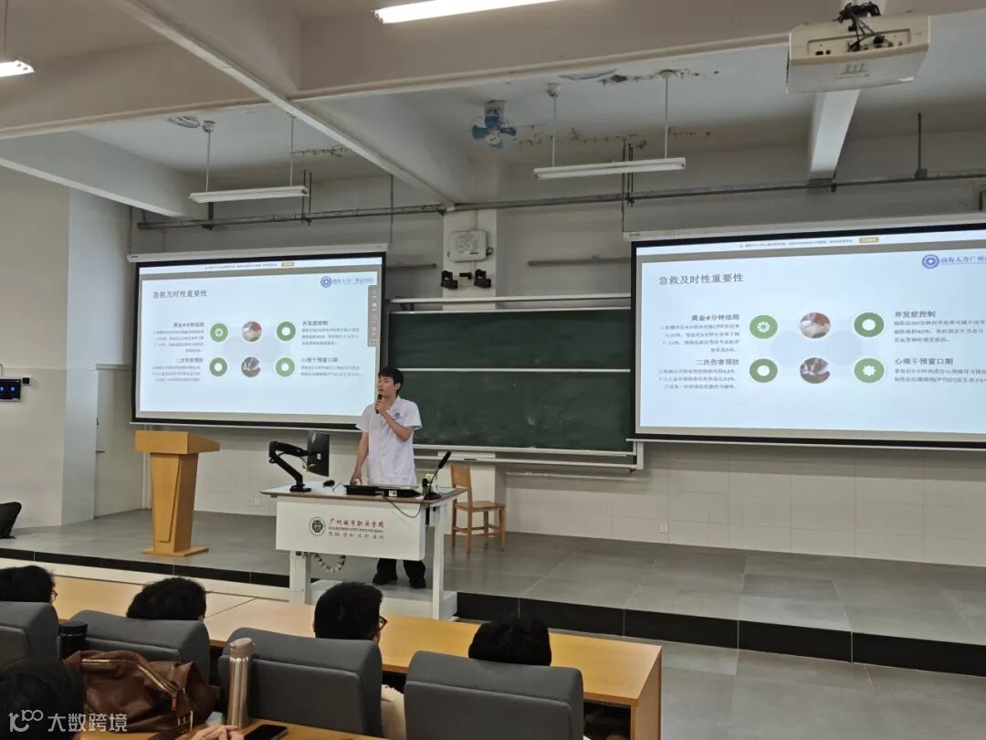本次讲座是学校联合增城区人力资源和社会保障局、前海人寿广州总医院和广东弘毅文化传媒有限公司共同举办的活动,主讲嘉宾是来自前海人寿广州总医院急诊科的曾祥宏护士,曾老师具有较丰富的临床经验,他先是分析了日常工作中常见的工伤种类和易发生的情况,接着是围绕了心肺复苏方法、AED使用方法、海姆立克急救法、烫伤冻伤、中暑等急救知识和具体操作手法展开讲解,最后还进行了现场的实操演习,帮助同学们进一步了解和掌握授课内容。通过本次讲座活动,旨在帮助大学生提前掌握工伤预防等相关知识,提高自我保护能力,降低未来工作中的工伤发生率,有助于毕业生的职业发展。