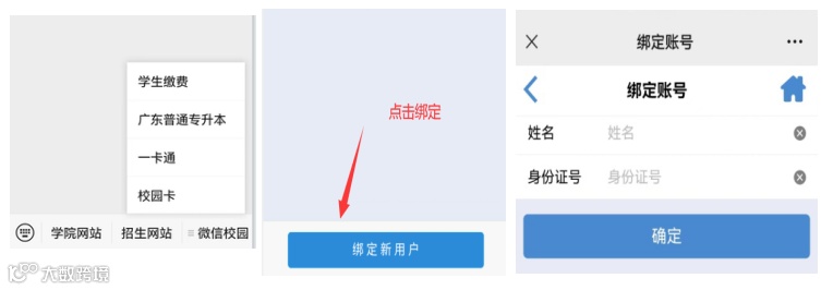 点击菜单“【微信校园】”,看到【学生缴费】;进入绑定新用户页面,显示绑定账号:输入本人姓名,身份证号,点击确定。