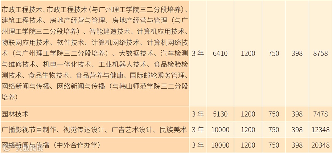 注:① 由于住宿条件不同,广园校区和海珠校区住宿费收费标准为500-1200元/学年,住宿费预收1200元/学年,花都校区住宿费收费标准为1500-1700元/学年,住宿费预收1700元/学年。住宿费根据学生来校报到以后按实际入住的宿舍收费标准收取(走读生不用交住宿费),住宿费多退少补,多收部分统一退到学校为新生开设的工商银行卡。