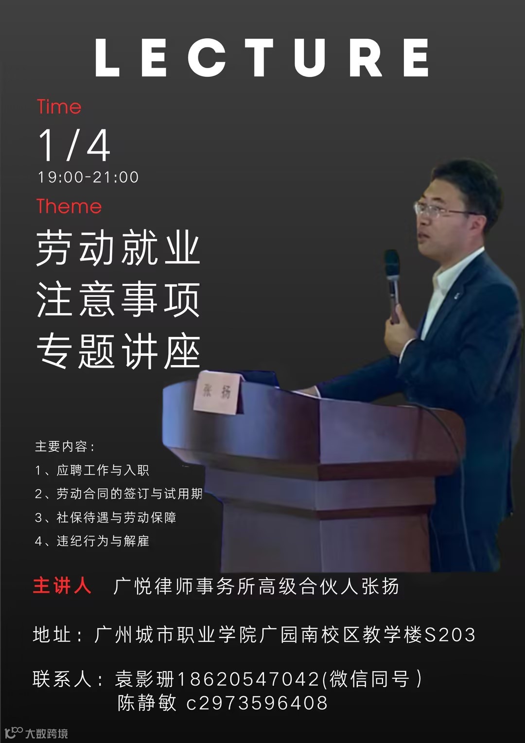 讲座主要内容:应聘工作与入职、劳动合同的签订与试用期、社保待遇与劳动保障、违纪行为与解雇