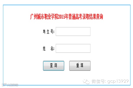 2015年8月8日起可查询广州城市职业学院录取结果(http://asp.gcp.edu.cn/gkcx/lqcj.asp),数据更新至8月8日18:00时,录取结果以收到录取通知书为准!