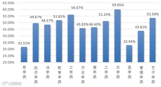 2015年毕业研究生中,农学类毕业生到基层就业的人数占该学科人数的比例最大,为59.95%。哲学类毕业生到基层就业的人数占该学科人数的比例最小,为31.51%;其次是医学类,为32.94%。